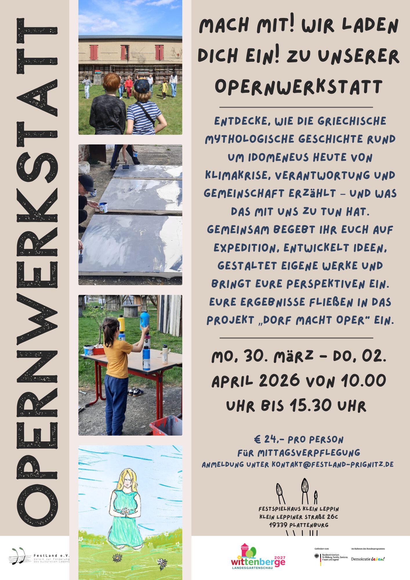 Der Verein FestLand e.V. bringt seit nun mehr 20 Jahren die Oper aufs Dorf in Klein Leppin. Viele begeisterte Besucher kommen alljährlich in das kleine Prignitzdorf, um dieses Opernwochenende zu erleben. Darüber hinaus eröffnet das Landfest die Spielsaison, die neben der Oper auch noch die Opernwerkstatt, das SommerKunstcamp für Kinder und weitere verschiedene Veranstaltungen beinhaltet. Mit einem kleinen feinen Weihnachtsmarkt geht’s das Jahr voller kultureller Höhepunkt dann in die verdiente Winterpause bis es wieder heißt – Dorf macht Oper.